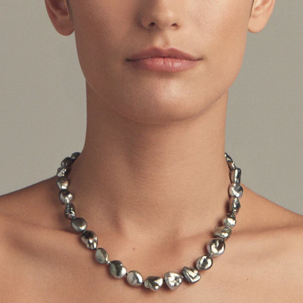 タヒチアンパールはフランス領ポリネシア、特にタヒチ周辺で養殖されています。形はラウンド、ドロップ、バロックなど多様で、色はグリーン、ブラック、ブルー、ピーコック、パープルさらには深いナス色など、濃くエキゾチックな色合いで知られています。サイズは一般的に8mm~18mmと存在感があり、さらに大粒のものが採れることもあります。独特のメタリックな光沢を持ち、そのドラマティックな色彩の変化や個性豊かな美しさから世界中で高い人気を誇ります。
